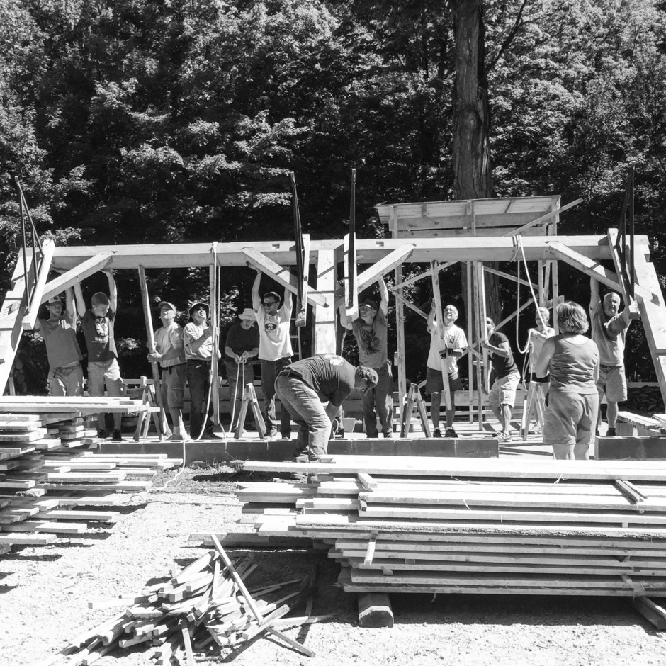 After the walls were raised, the next challenge was putting on the roof rafters. My dad, being the engineer he is, decided that using a “gin pole” would be our best approach. Dan found a tall, straight, fresh oak tree in the woods and cut it down. We used pulley’s to raise it up next to the barn and attached a block and tackle pulley system to the top of the pole. Then, we attached the roof rafters and pulled them right up! Well, sort of. Sometimes it took a little finagling….